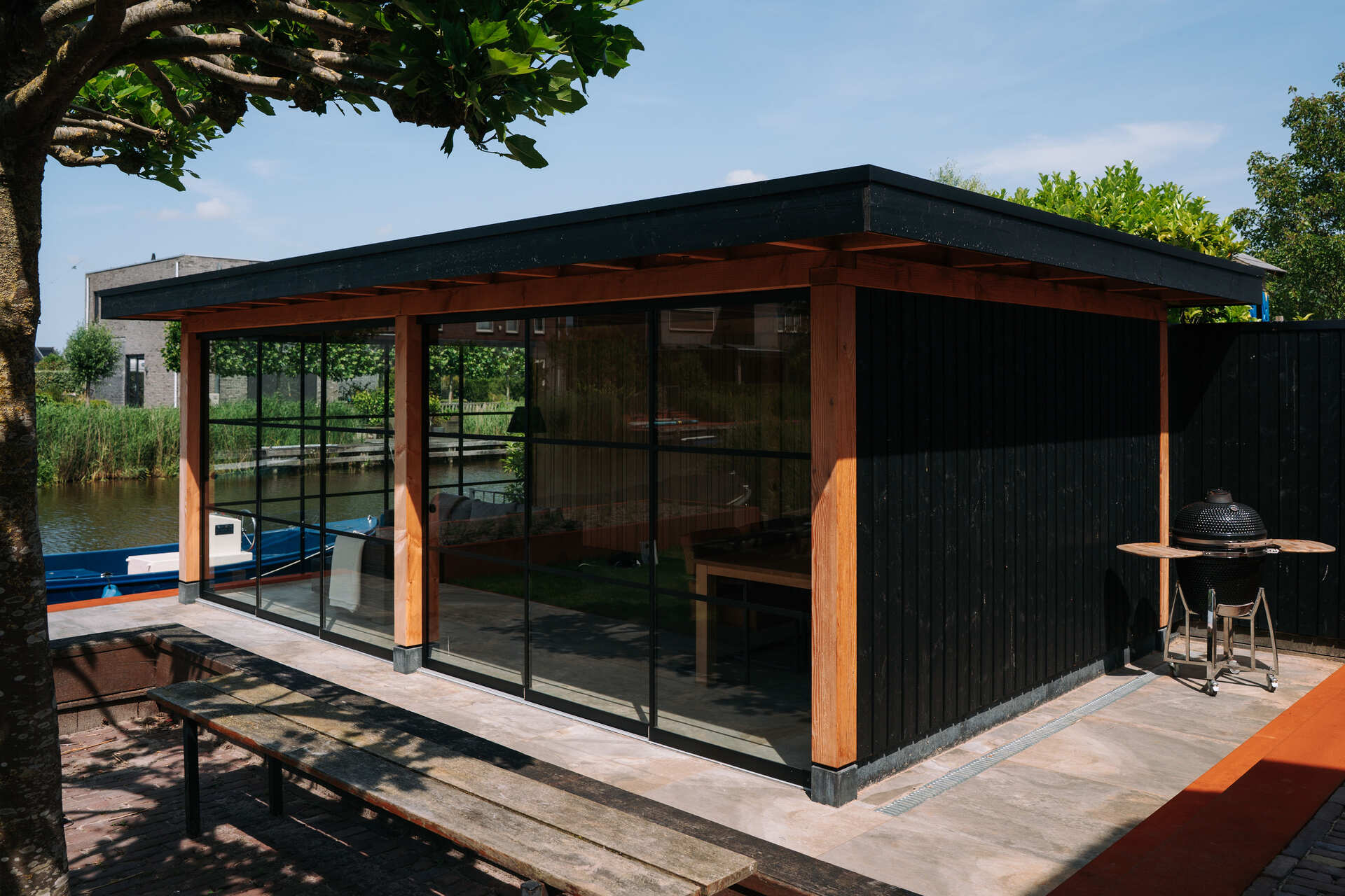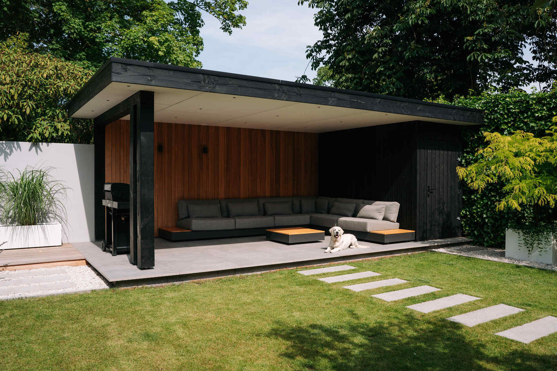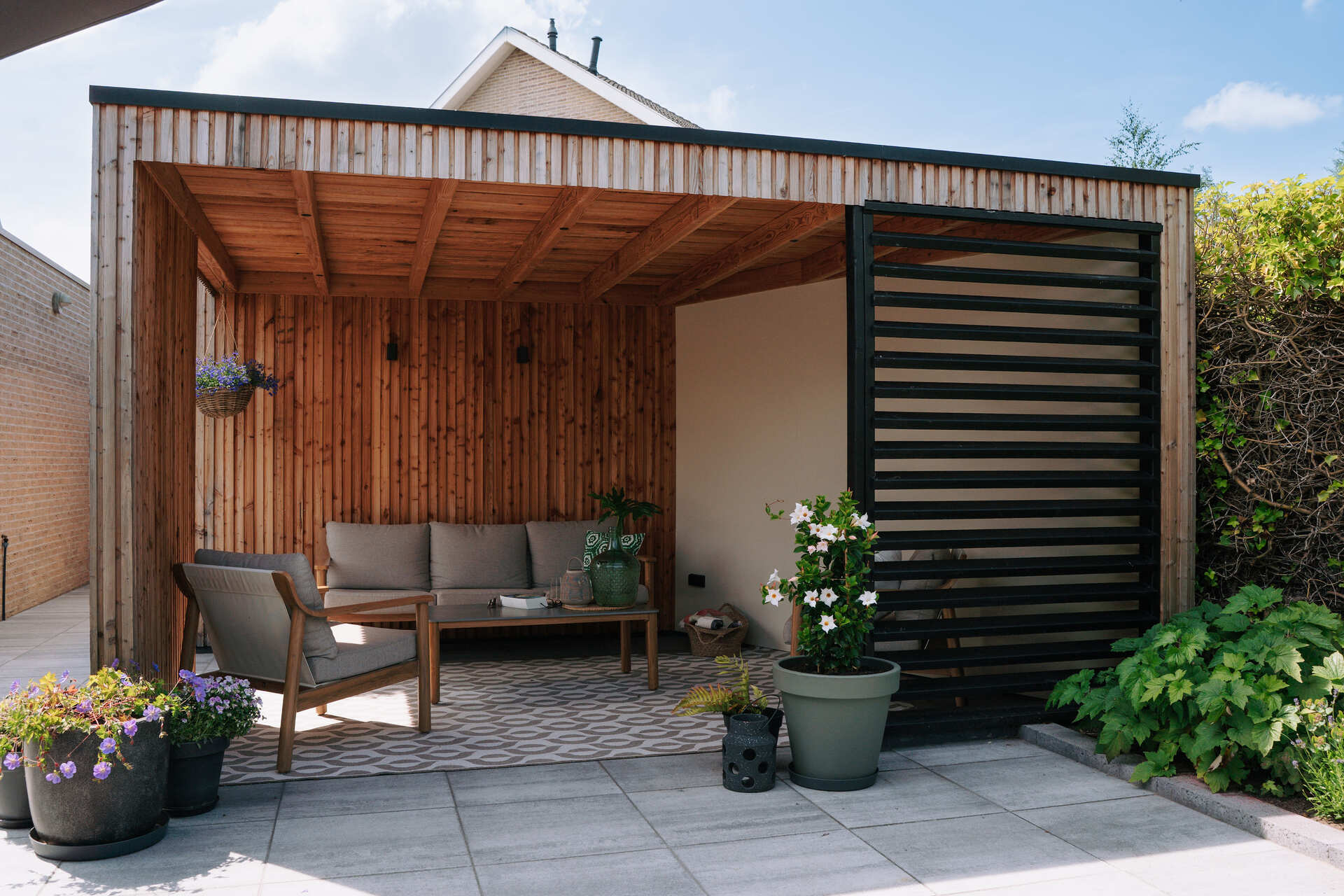 Combineer een ruime berging, haardhoutopslag en een sfeervolle loungeplek onder één dak. Wil je nog meer comfort? Sluit de overdekte loungeplek af met glazen schuifwanden en maak de ruimte compleet met een kachel en buitenkeuken.
